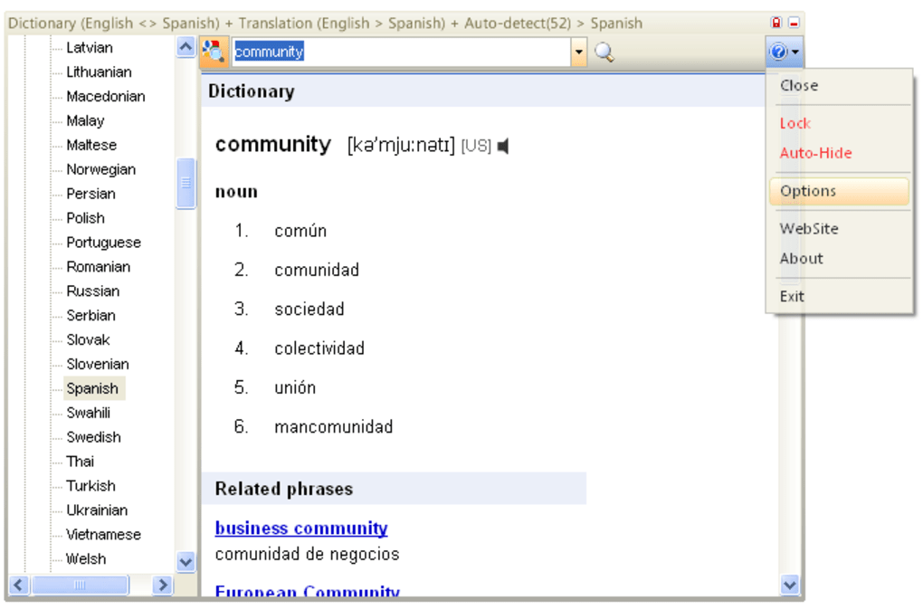Dictionary.NET doesn’t require installation, and runs unnoticed in the background. You can open it with a keyboard shortcut, a mouse combination, or from the program’s icon on the System Tray, and then enter whatever word or sentence you want to translate. Another option probably easier, is selecting a given word or sentence and then using the predefined keyboard shortcut or mouse combination to bring Dictionary.NET up with the translation already loaded.